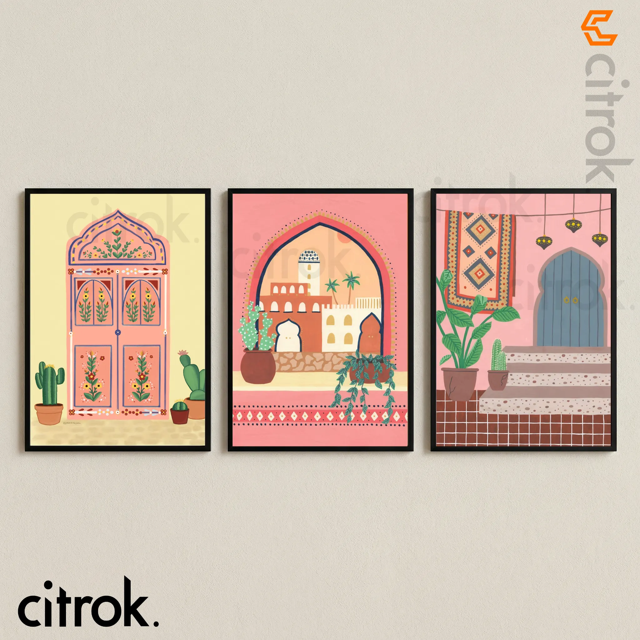 Moroccan Boho Wall Decor Set – Islamic Arch, Door & Plants Art- BB030