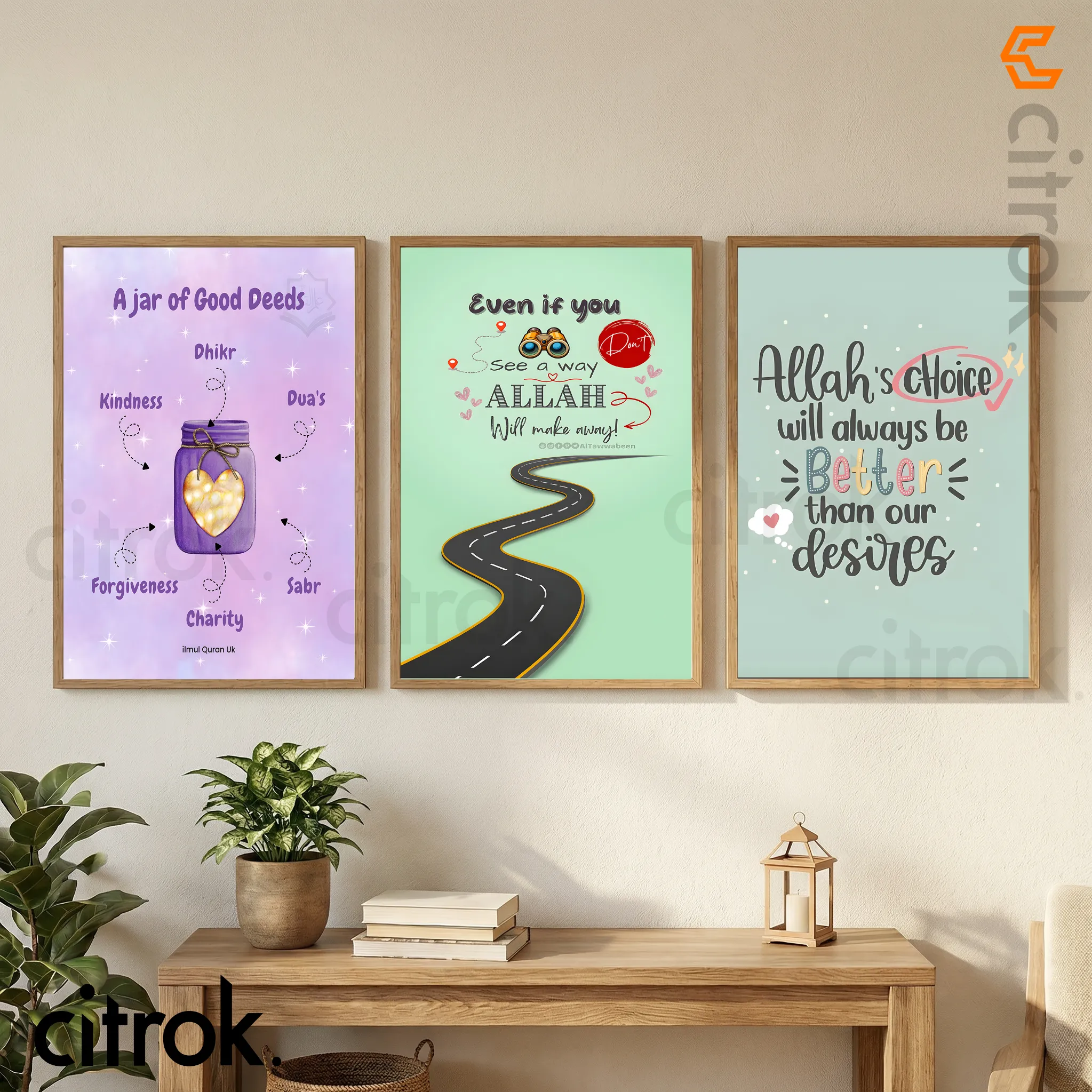 Islamic Wall Art Set of 3 – Kaaba, Mosque & Islamic Quote combo- BB028